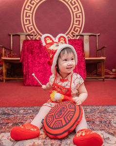 在優雅的「紅金配色」場景中,讓孩子穿上象徵勇氣與平安的虎衣虎鞋,
